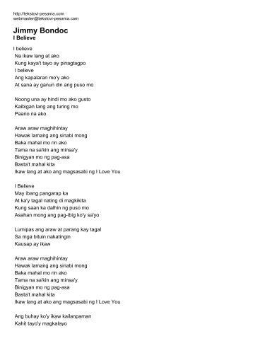I believe Na ikaw lang at ako Kung kayat tayo ay pinagtagpo I believe Ang kapalaran moy ako At sana ay ganun din ang puso mo Noong una ay hindi mo ako gusto. Top Jimmy Bondoc Lyrics Balang Araw Minette Out Of My League Dont Give Up On Us Tuwing Umuulan Musikero Let Me Be The One Hahanapin Kita Grow Old With You Wish You Were Mine The Man I Was With You. Jimmy Bondoc I Believe Lyrics.