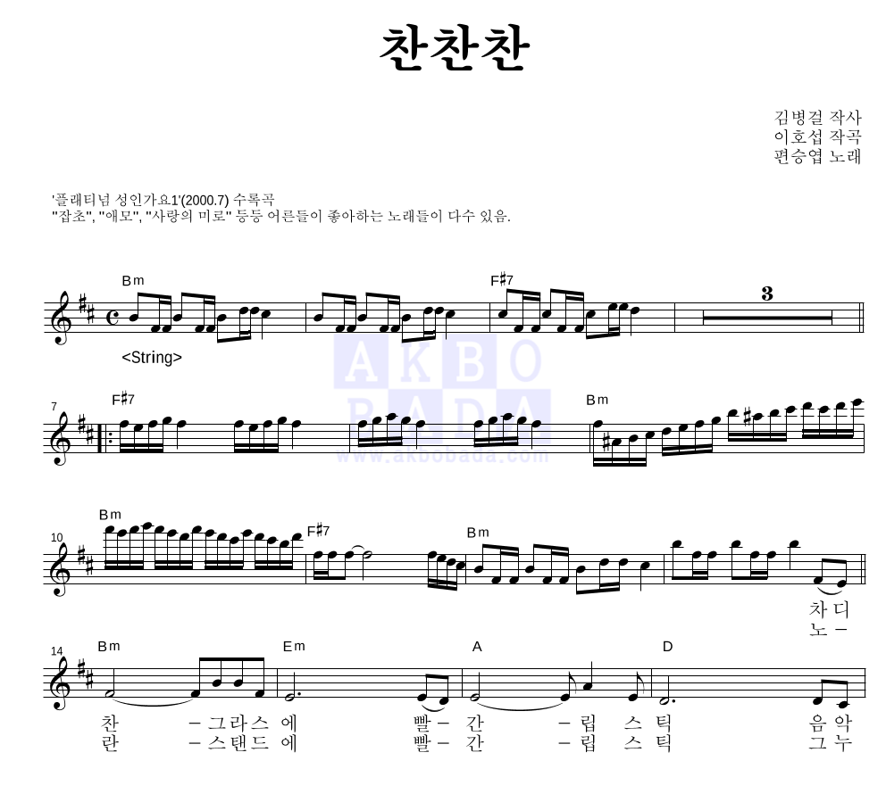 찬찬찬 가사 노래듣기 아이돌 김정남 찬찬찬 가사 노래듣기원곡 편승엽 노래 터보 김종국의 응원을 받으며 출연한 김정남의 춤이 정말 대단했네요. 찬찬찬 원곡-편승엽 찬찬찬 가사보기 작사 김병걸 작곡 이호섭 노래 동래이훈 1. 편승엽 - 찬찬찬의 상세 페이지 - 악보나라 악보.