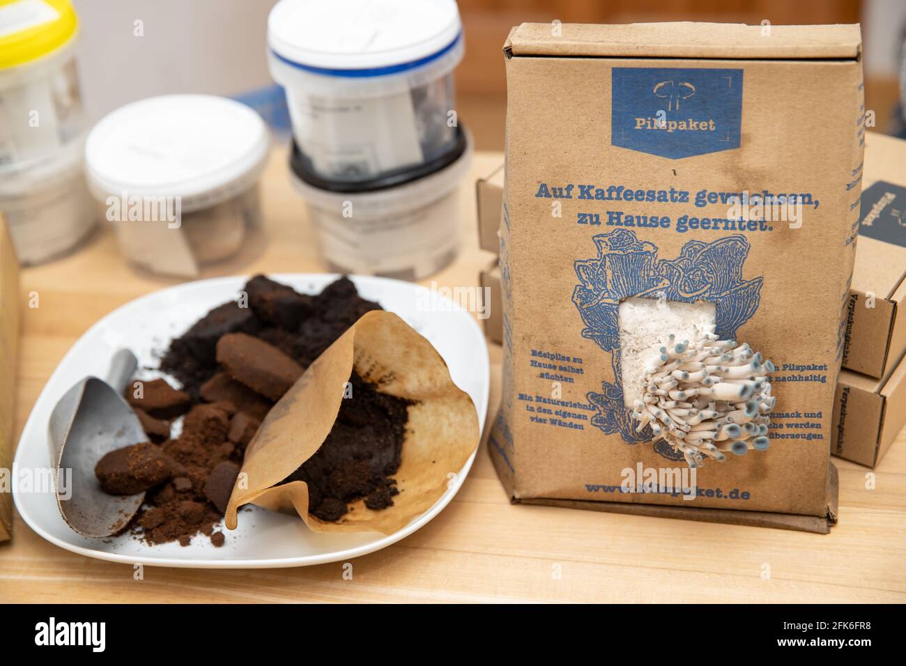 Nuremberg Germany 19th Apr 2021 Pigeon Blue Oyster Mushrooms Grow From A Mushroom Growing Set By Ralph Haydl A Mushroom Substrate Consisting Of Coffee Grounds With Mushroom Spawn Next To It